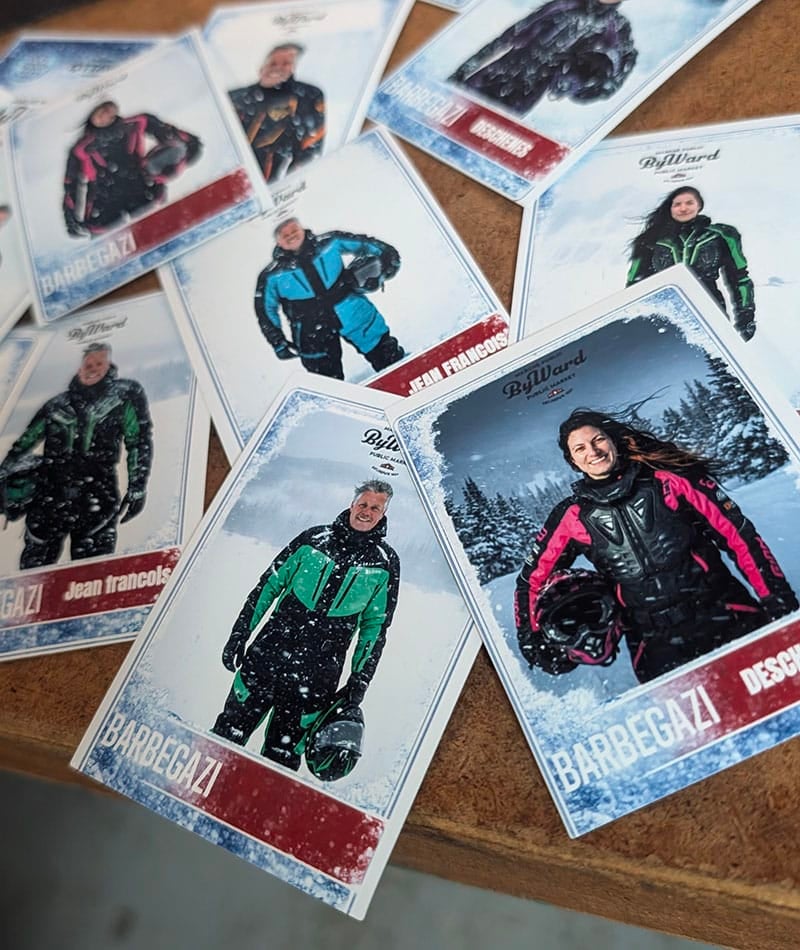 Le montage de la carte sportive se fait sur place et prend 2 minutes à créer. Étape : on prend la photo ; on imprime ; on coupe ; on assemble ; on insère dans la pochette et on vous donne le sourire. Aussi simple que ”Bonjour”! 😉